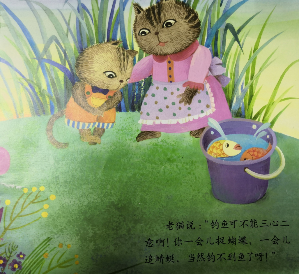 《小猫钓鱼》的故事内容简单易懂,活泼生动,通过小猫从钓不到鱼再到最后终于钓到大鱼的故事,启发小朋友们懂得,做事不能三心二意,要学会一心一意!