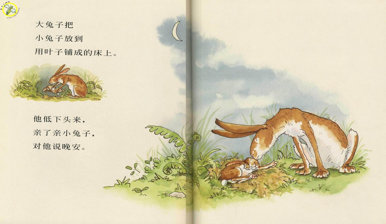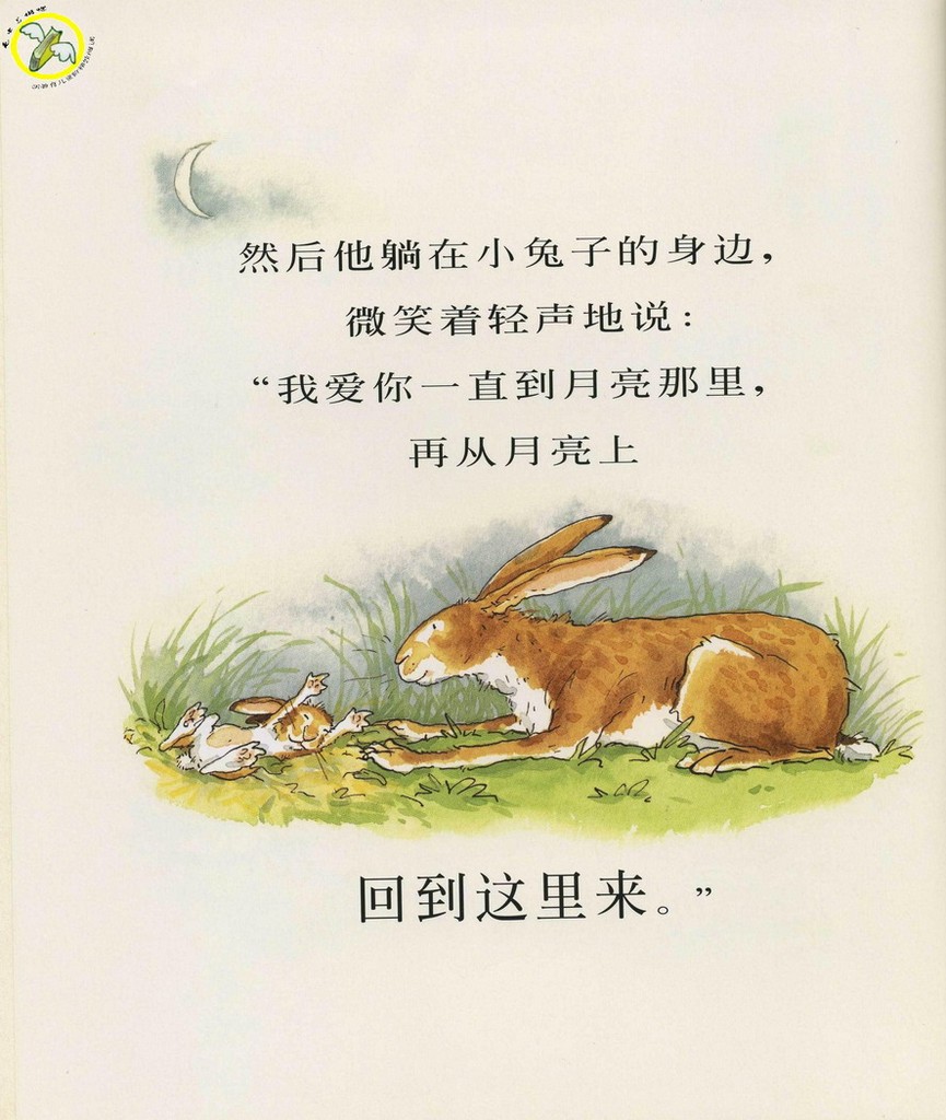 然后他躺在小兔子的身边,微笑着轻声地说:““我爱你一直到月亮那里,