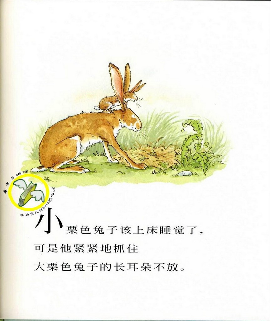 小栗色兔子该上床睡觉了,可是他紧紧地抓住大栗色兔子的长耳朵不放。