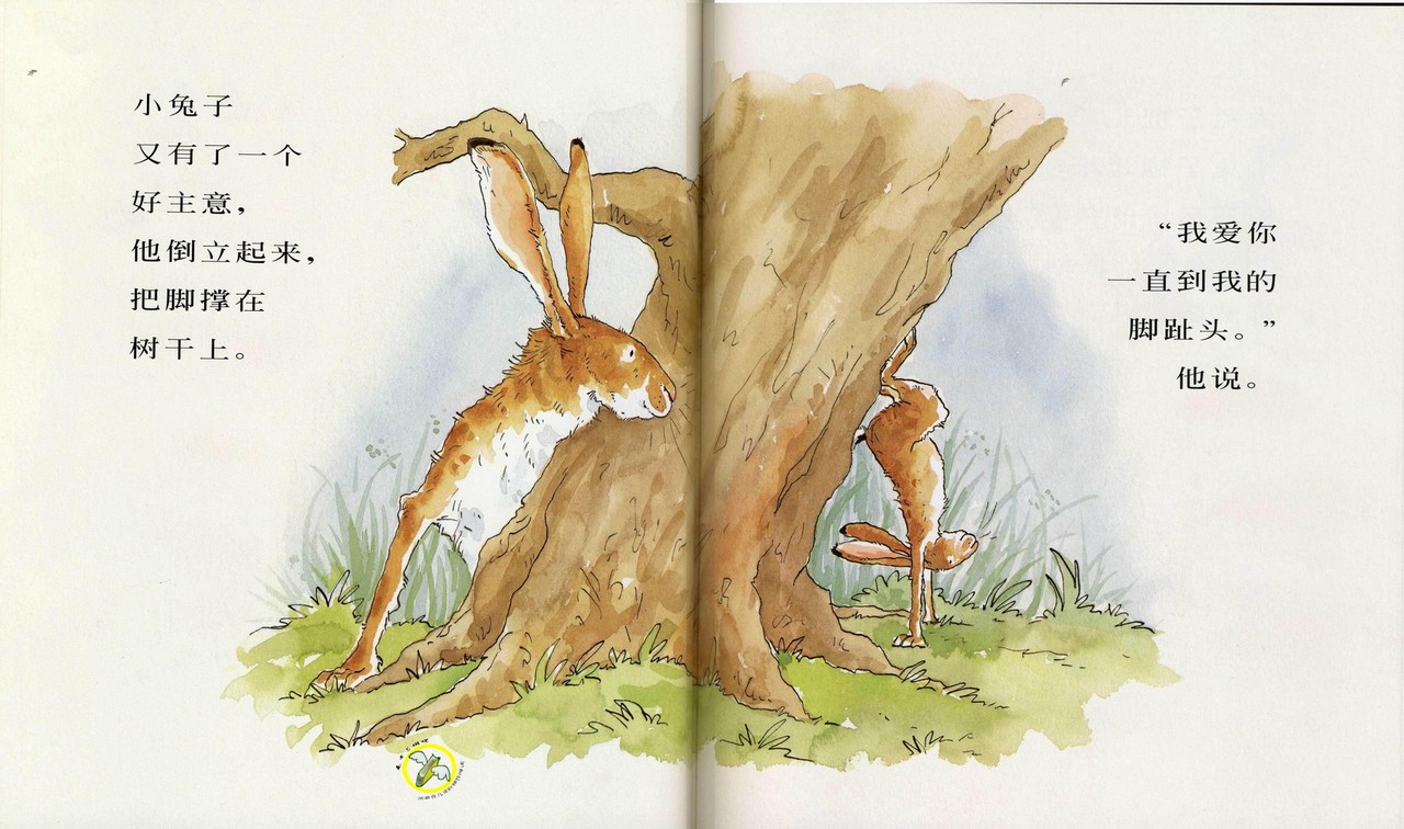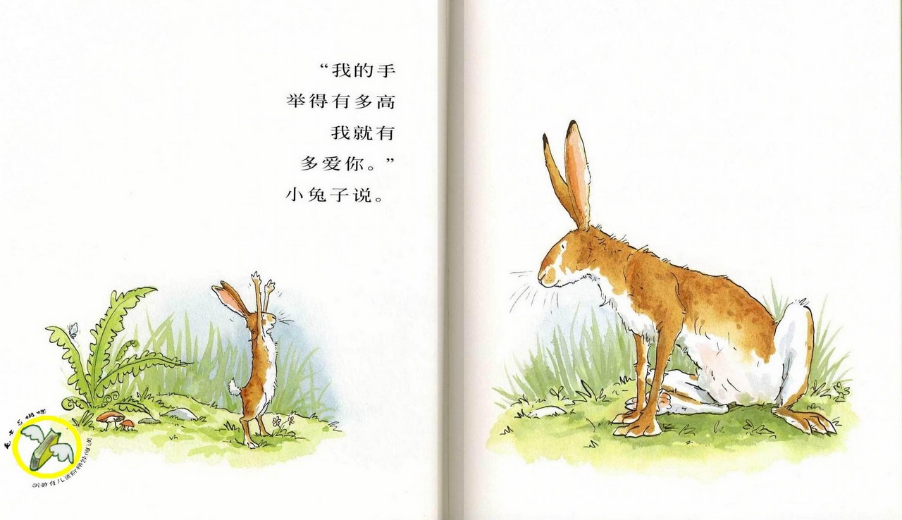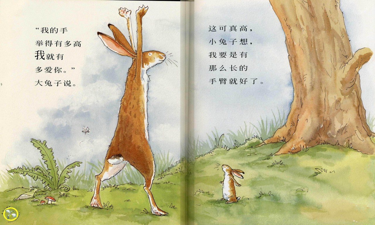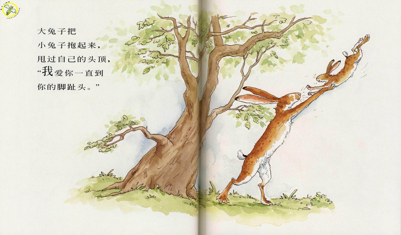 大兔子把小兔子抱起来,甩过自己的头顶,我爱你一直到你的脚趾头。”