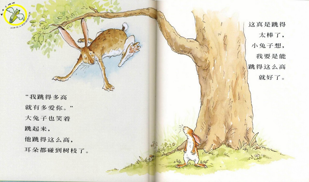 “我跳得多高就有多爱你。”大兔子也笑着跳起来,他跳得这么高,耳朵都碰到树枝了。