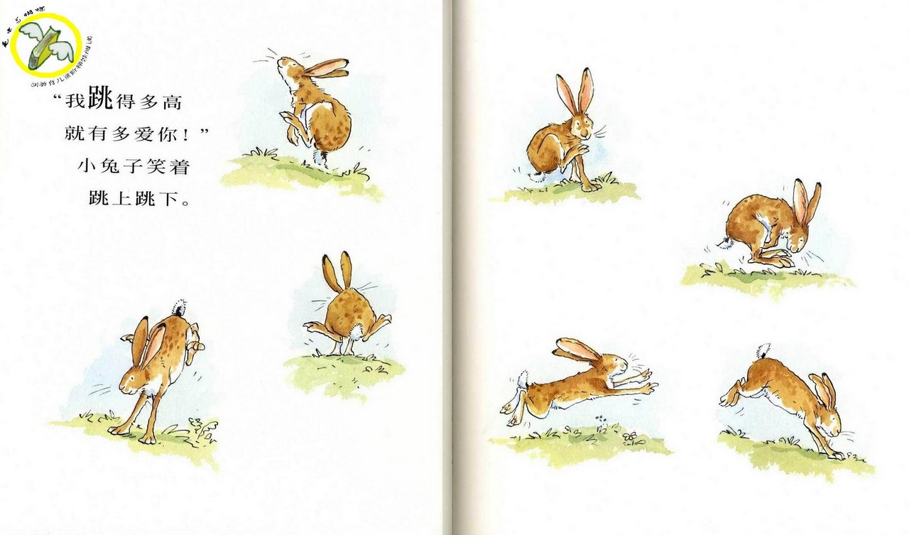 “我得多高就有多爱你!小兔子笑着跳上跳下。