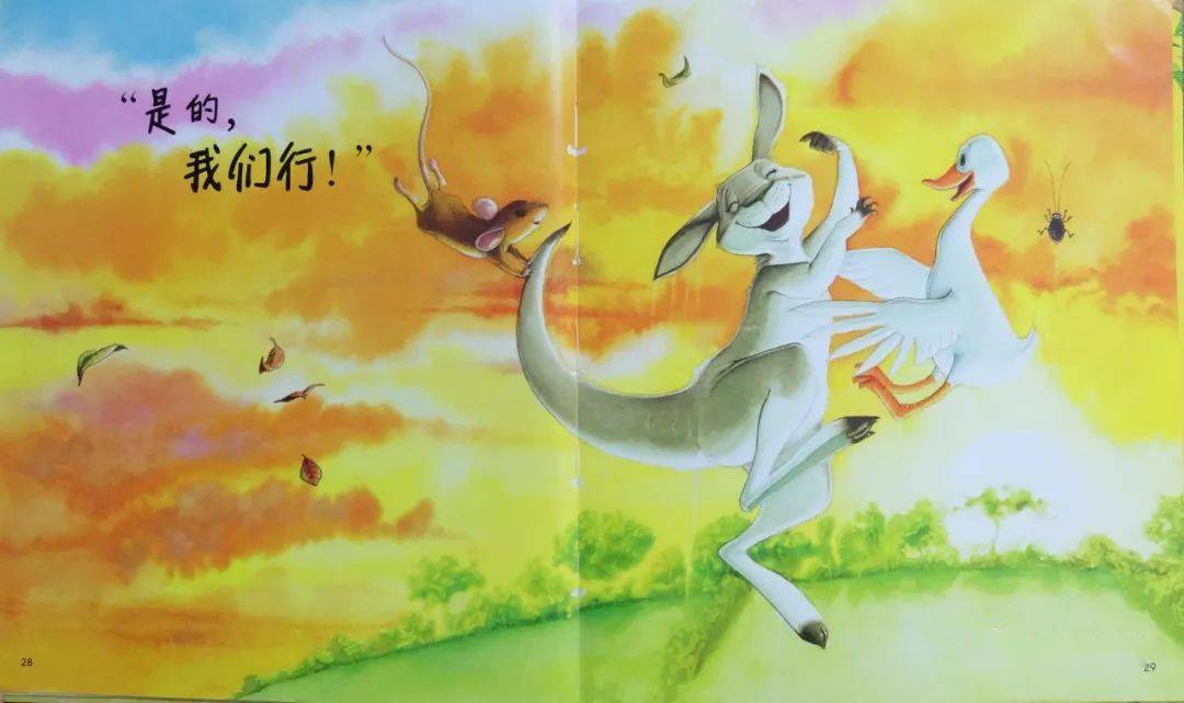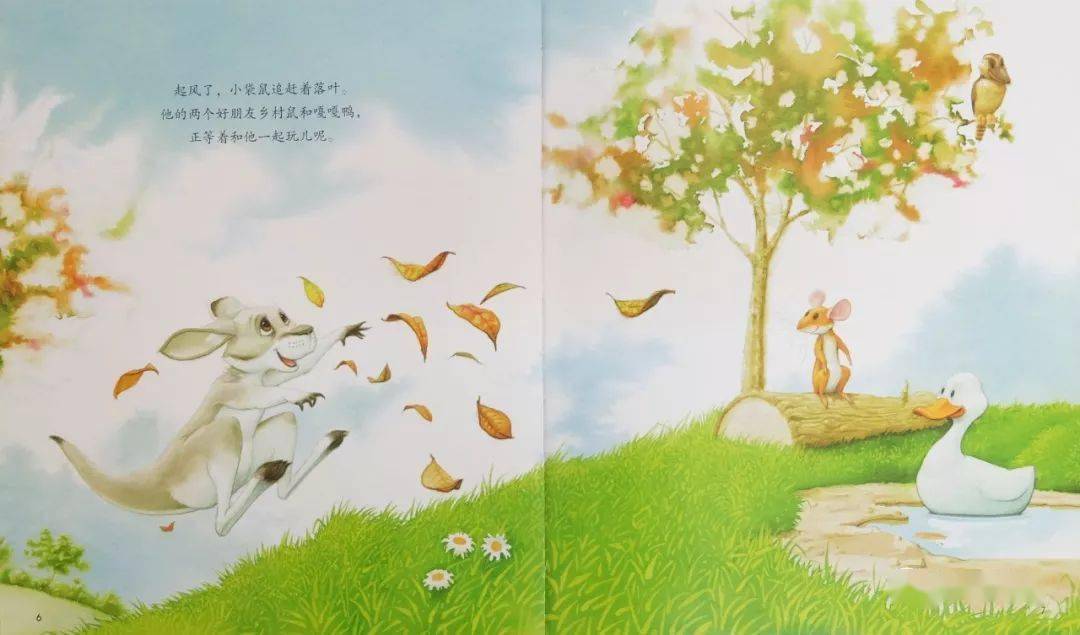 小袋鼠转了一圈又一圈,逗得乡村鼠和嘎嘎鸭大笑不止。