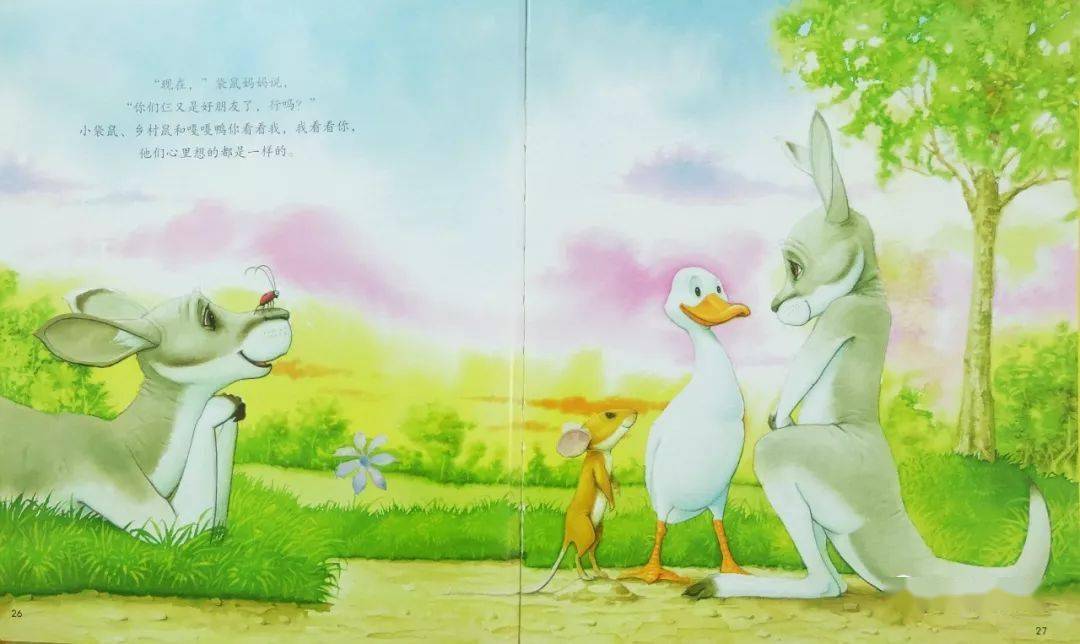 小袋鼠、乡村鼠和嘎嘎鸭你看看我,我看看你,他们心里想的都是一样的。
