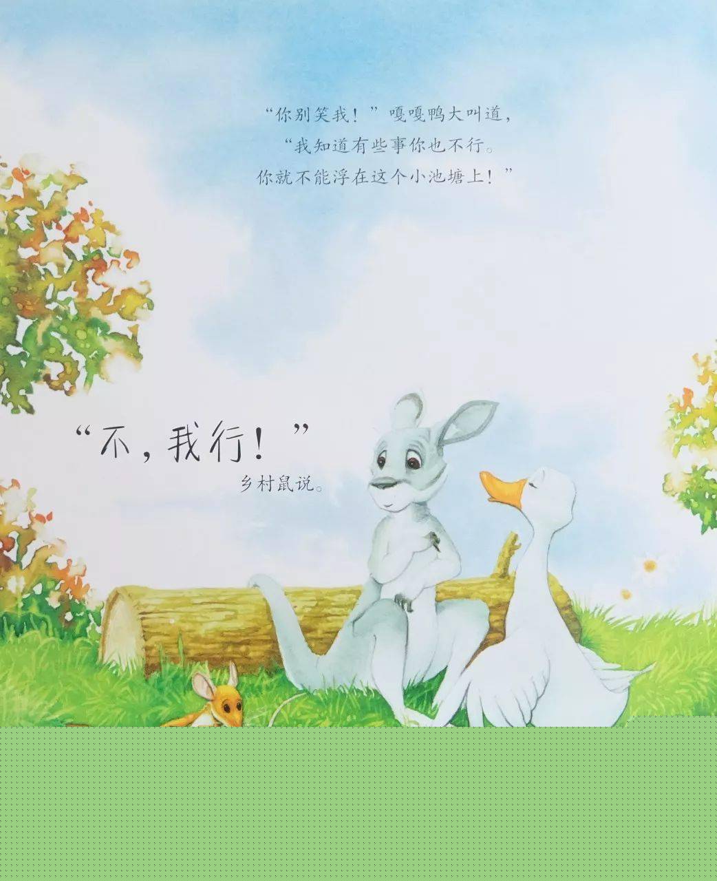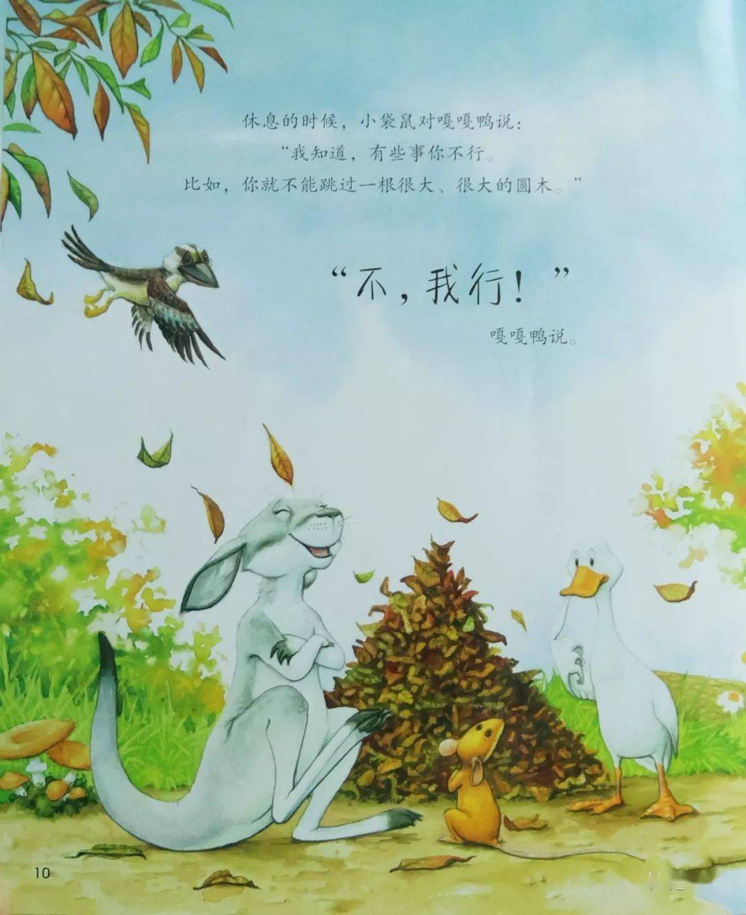休息的时候,小袋鼠对嘎嘎鸭说:“我知道,有些事你不行。比如,你就不能跳过一根很大、很大的圆木。”