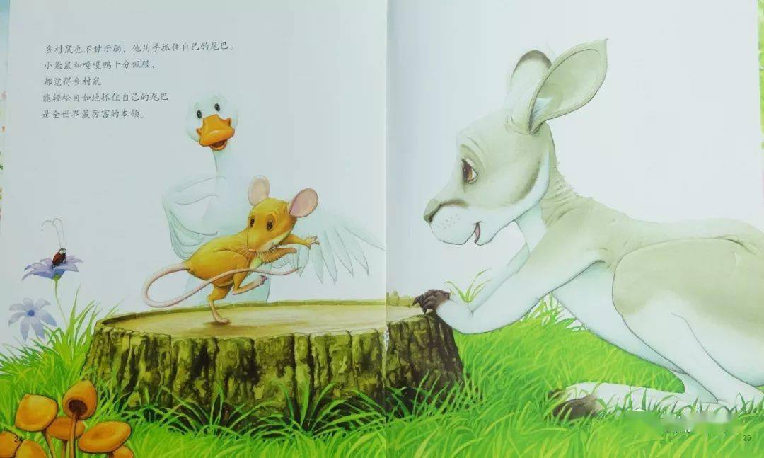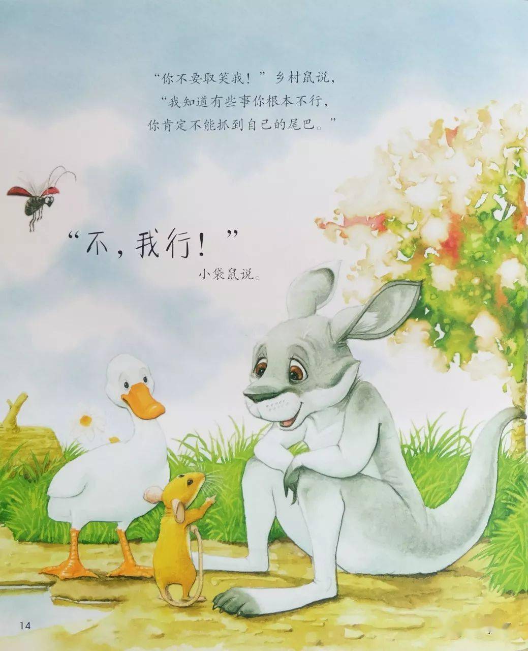 小袋鼠和嘎嘎鸭十分佩服,都觉得乡村鼠能轻松自如地抓住自己的尾巴是全世界最厉害的本领。