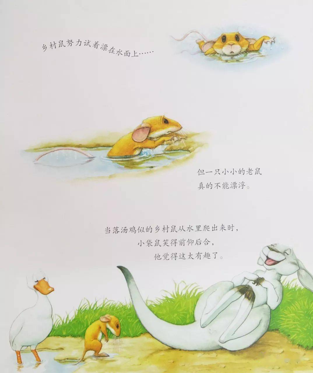 当落汤鸡似的乡村鼠从水里爬出来时,小袋鼠笑得前仰后合,他觉得这太有趣了。