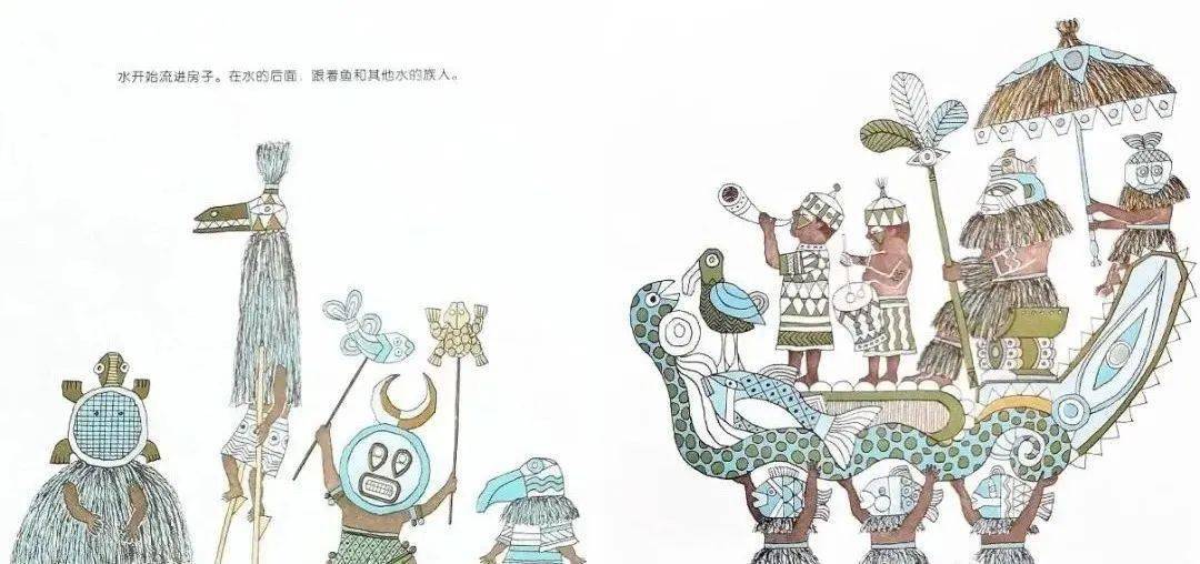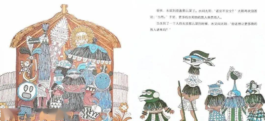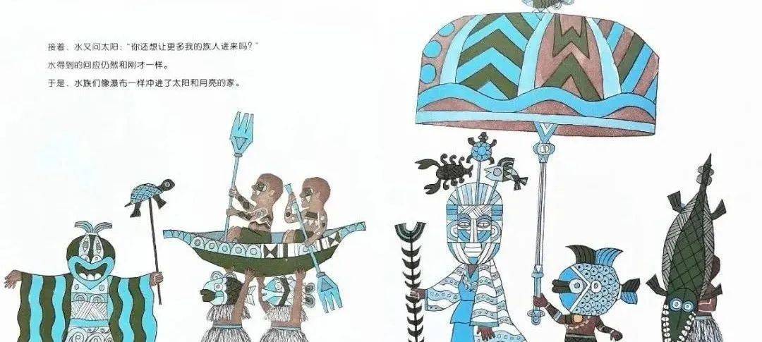 接着,水又问太阳:“你还想让更多我的族人进来吗?”水得到的回应仍然和刚才一样。于是,水族们像瀑布一样冲进了太阳和月亮的家。