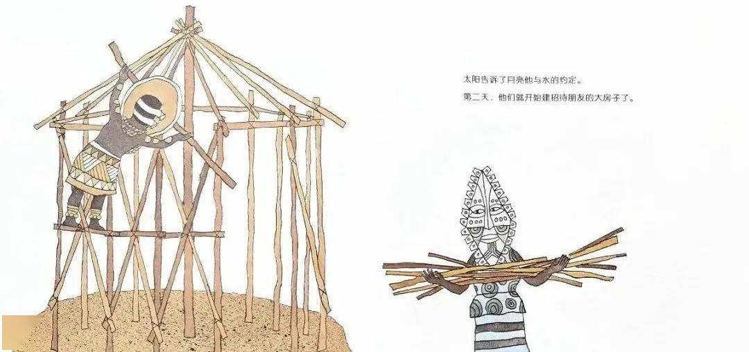 太阳告诉了月亮他与水的约定。第二天,他们就开始建招待朋友的大房子了。