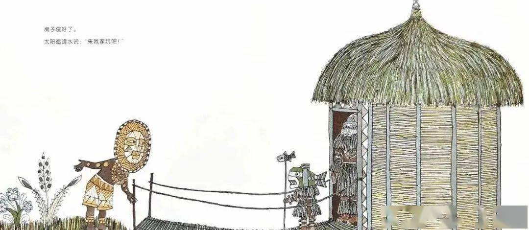 太阳向水承诺:“我会建一座很大的房子。”太阳回到了家,他的妻子——月亮,正灿烂的笑着迎接他。