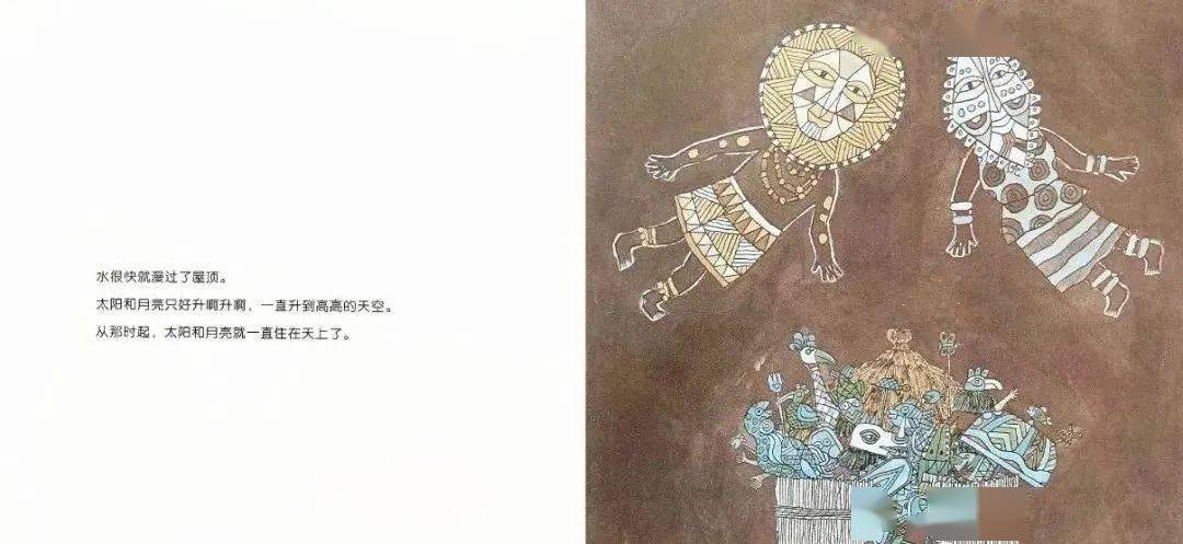 水很快就漫过了屋顶。太阳和月亮只好升啊升啊,一直升到高高的天空。从那时起,太阳和月亮就一直住在天上了。