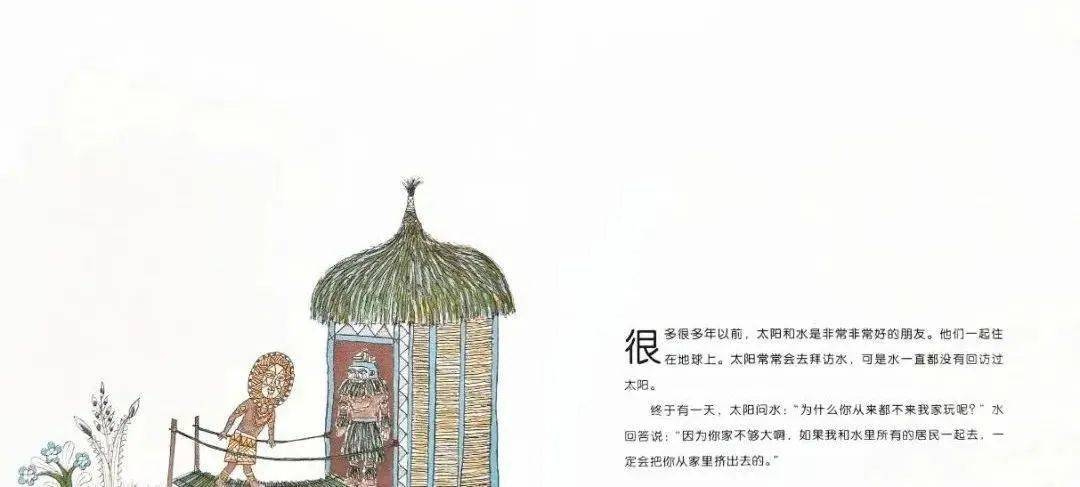 很多很多年以前,太阳和水是非常非常好的朋友。他们一起住在地球上。太阳常常会去拜访水,可是水一直都没有回访过太阳。终于有一天,太阳问水:“为什么你从来都不来我家玩呢?”水回答说:“因为你家不够大啊,如果我和水里所有的居民一起去,一定会把你从家里挤出来的。”