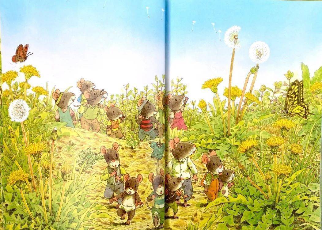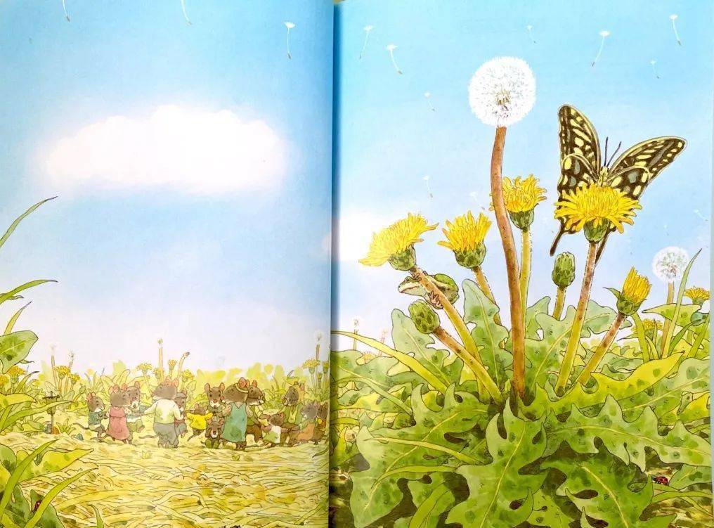 啊,肚子饿啦。坐在蒲公英原野上吃饭,真好吃!咕嘟,老五喝了一口凉水。