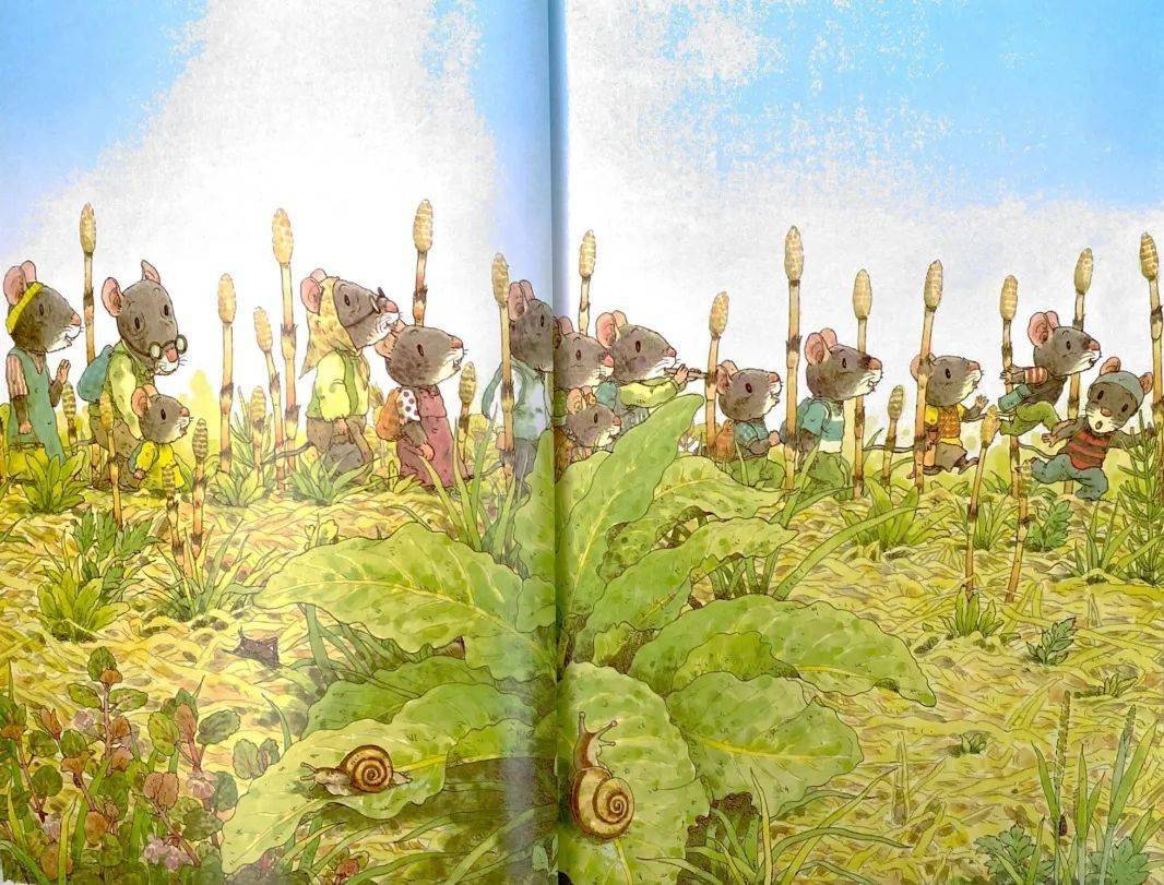 老大吹起了笛子,嘟,嘟,嘟。大家排成一排,走在长满笔头菜的小路上,嗒,嗒,嗒。