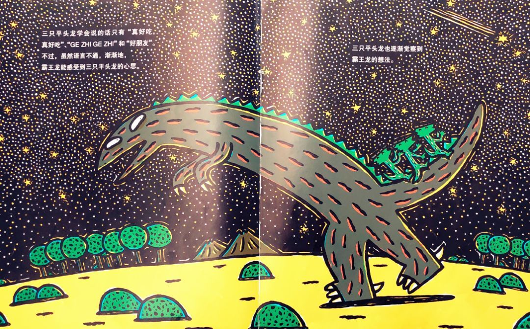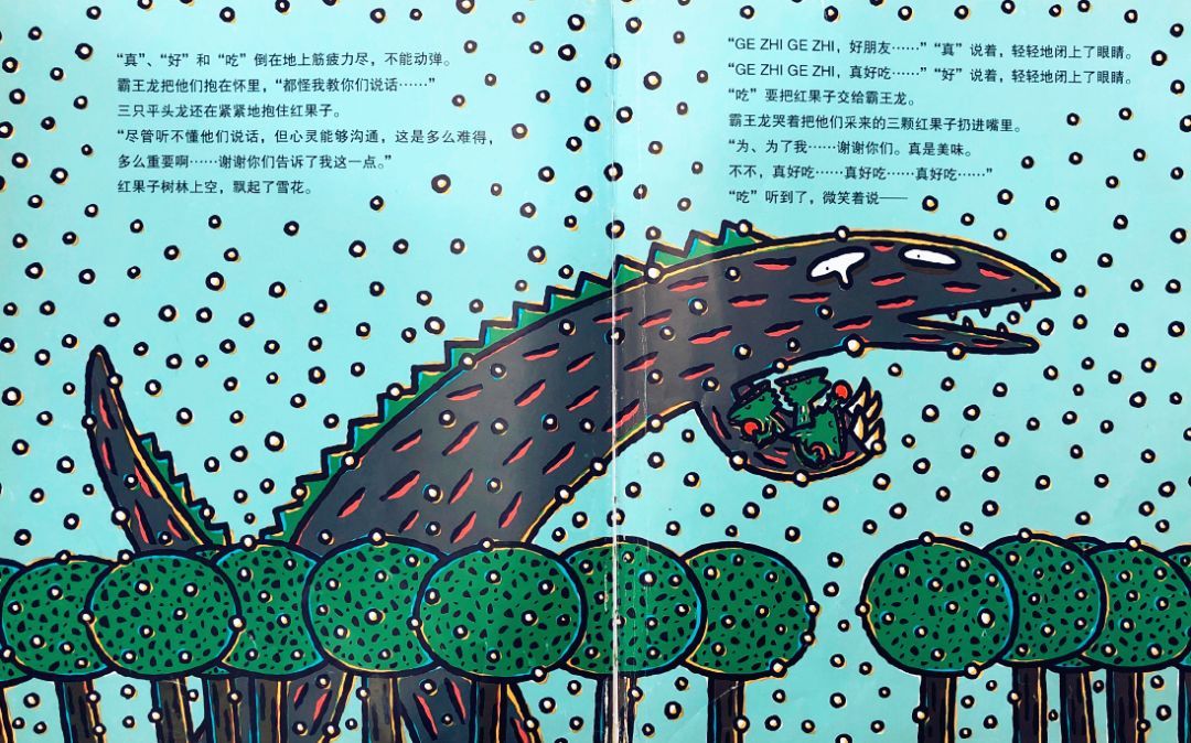 另一方面,作者对霸王龙和小平头龙的心理活动描写得十分细致。比如,小平头龙因为霸王龙吃掉自己带来的食物而开心,又因为霸王龙不爱吃红果子而落寞;霸王龙在和平头龙成为好朋友后,偶尔会产生小平头龙一定很好吃的想法。正是这些细节,成功的把我们带入到一个温暖的故事中去。