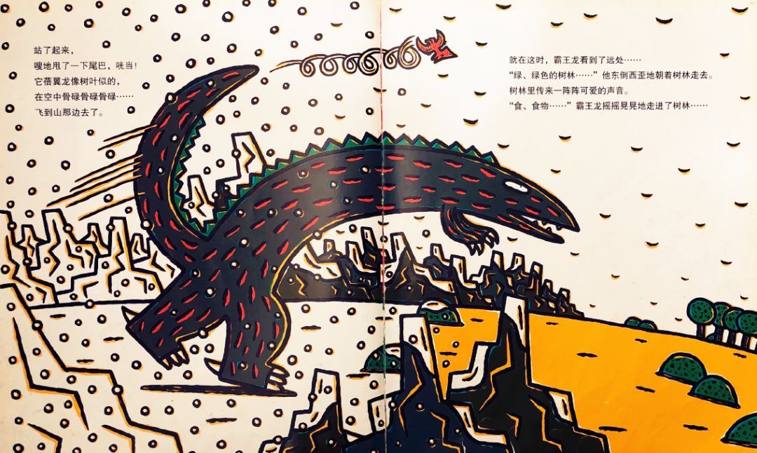 这时,有一只红色的它蓓翼龙对它说:“霸王龙先生,在山那边很远的绿林里,有很多好吃的家伙。”