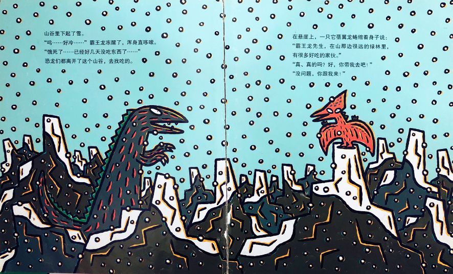 绿色皮肤、身材高大的霸王龙,住在深深的山谷里。冬天到了,山谷里飘起雪花,大家纷纷外出寻找食物。霸王龙也不例外。