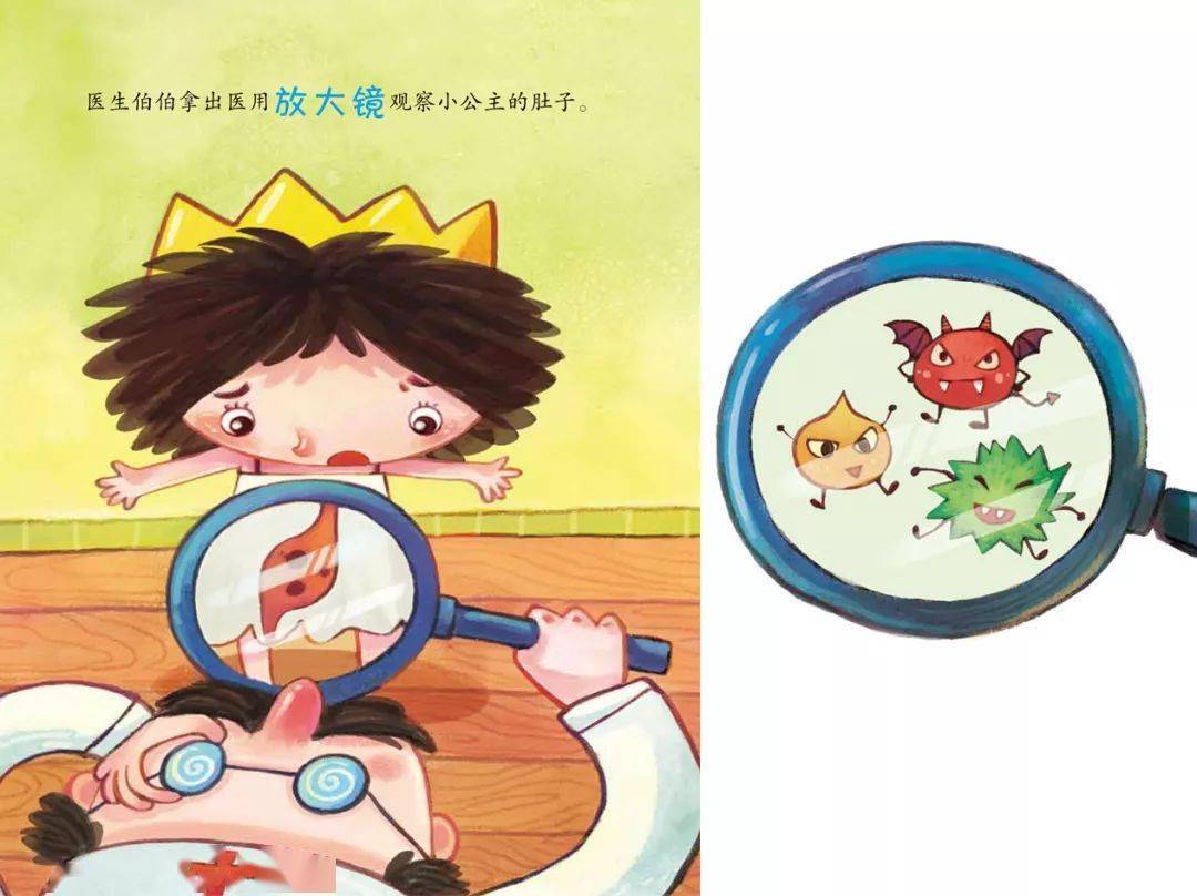 医生拿出放大镜观察小公主的肚子。哇!小公主的肚子里有好多细菌噢!