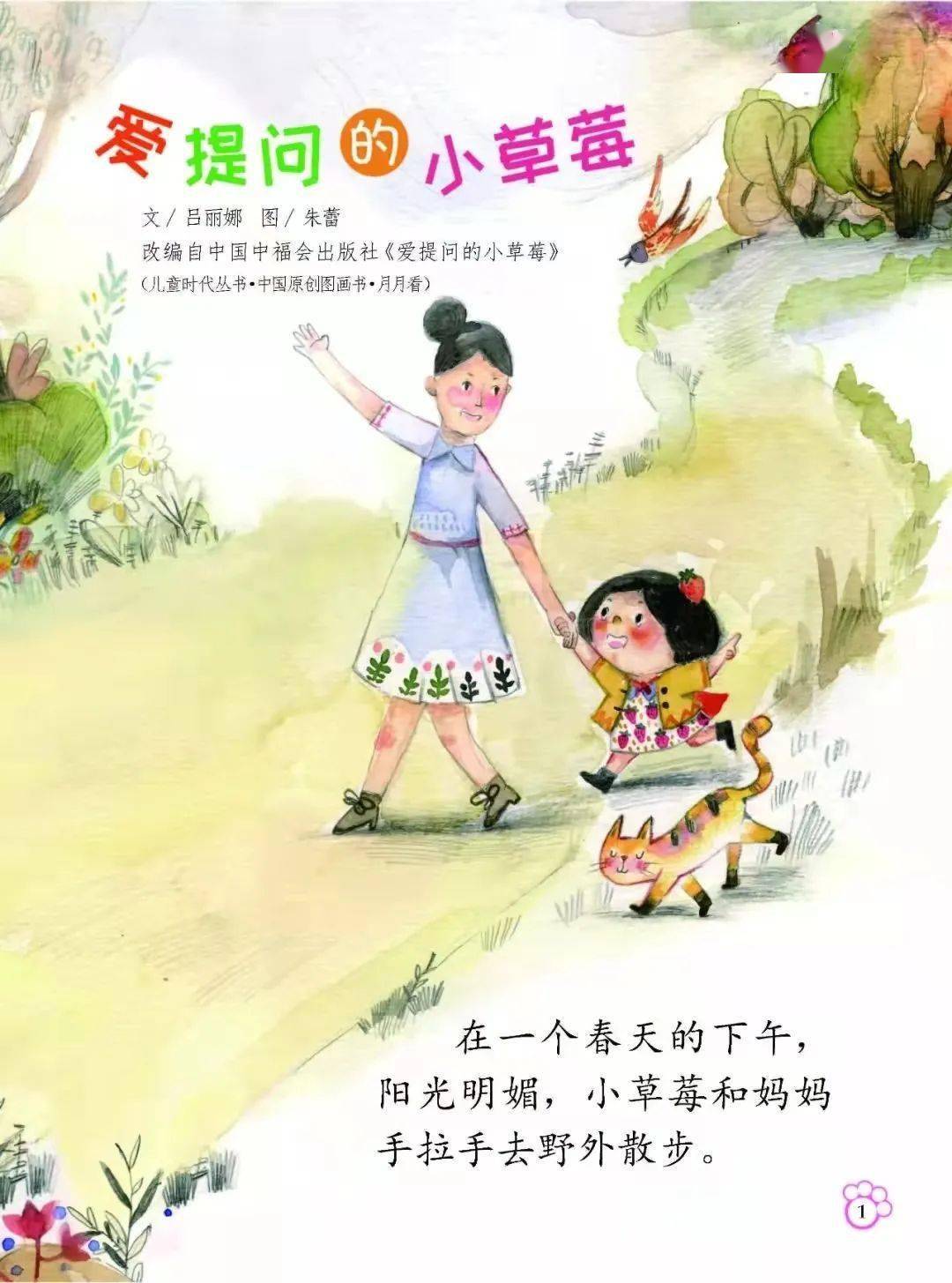 现在正是春天,空气潮湿温暖,微风阵阵,风里有泥土的清香,小草莓的妈妈一边走,一边愉快地哼着歌,不过她的歌声常常被小草莓叽叽喳喳的提问打断——