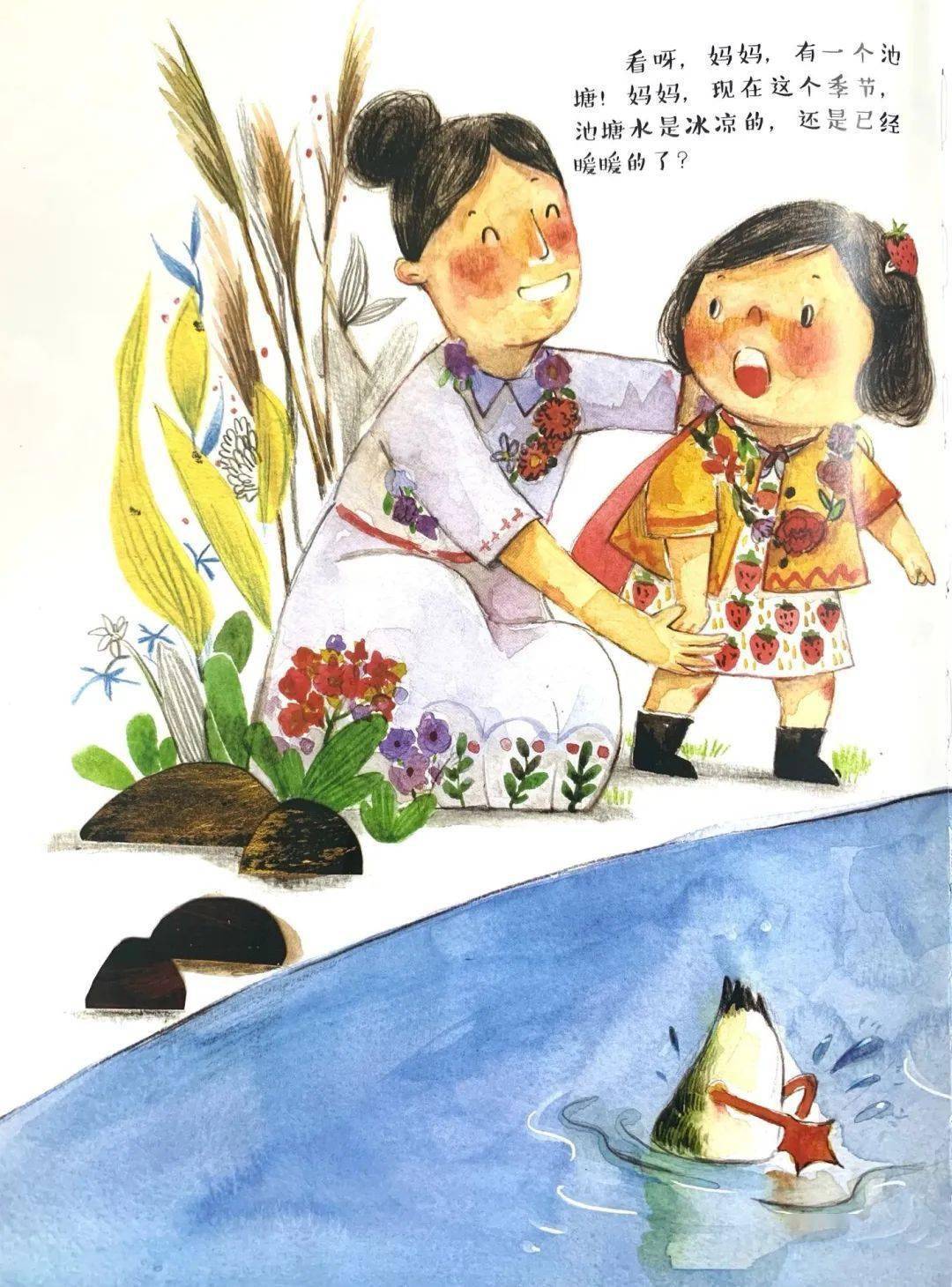 看呀,妈妈,有一个池塘!现在这个季节,池塘水是冰凉的,还是已经暖暖的了?
