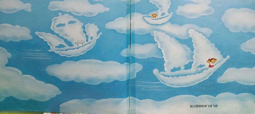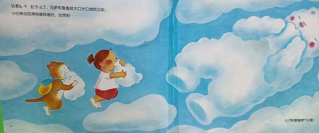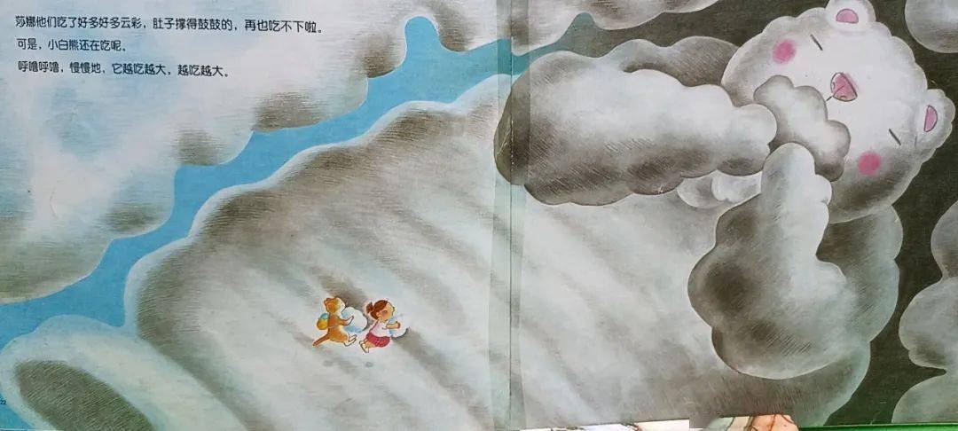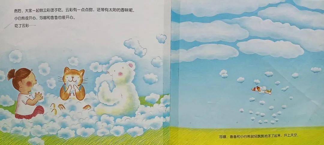 玩着玩着,肚子饿了,莎娜和鲁鲁就大口大口地吃云彩。