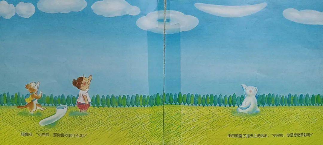 小白熊指了指天上的云彩。“小白熊,你是想吃云彩吗?”