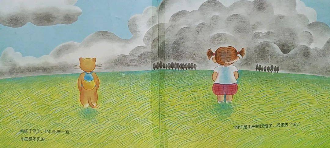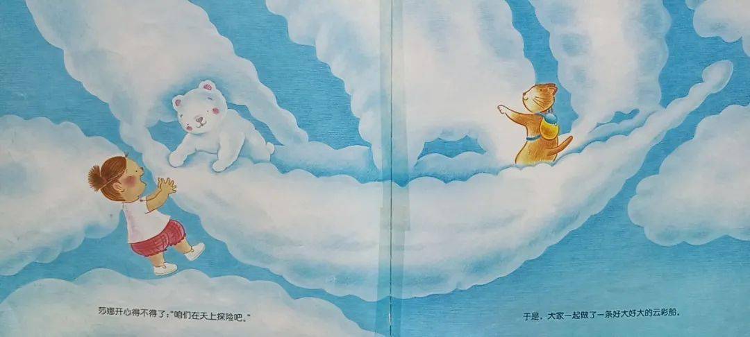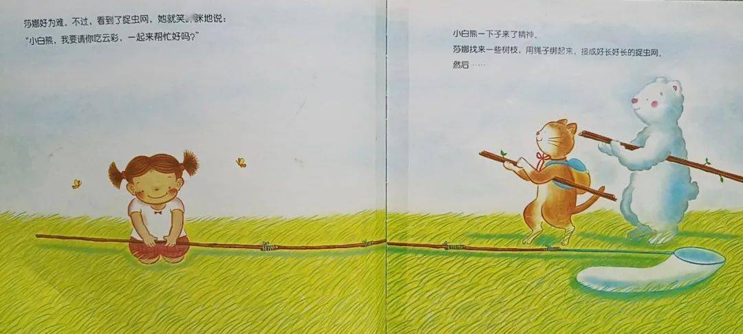 莎娜好为难。不过,看到了捉虫网,她就笑眯眯地说:“小白熊,我要请你吃云彩,一起来帮忙好吗?”