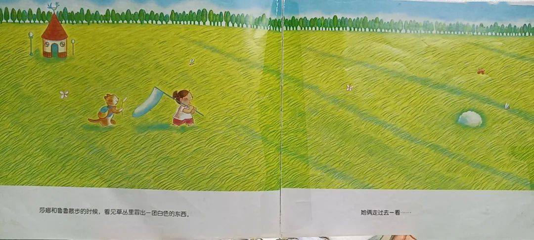 莎娜和鲁鲁散步的时候,看见草丛里冒出一团白色的东西。