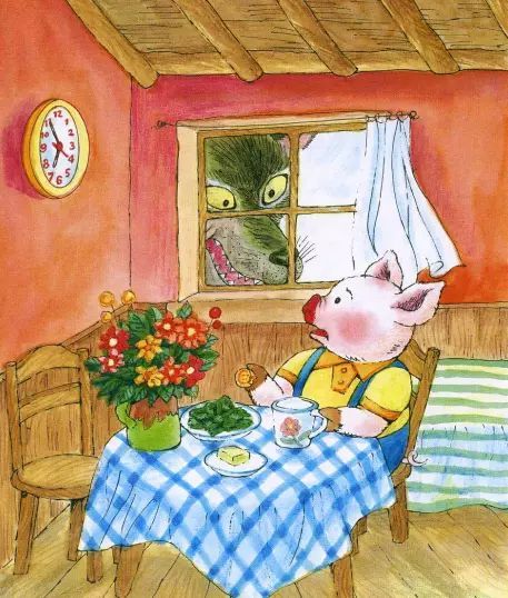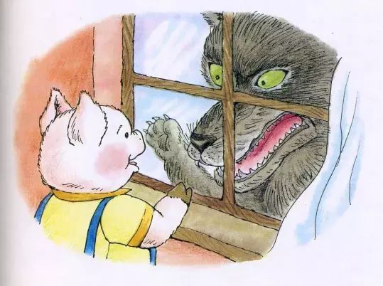 碰巧路过一头大灰狼,他敲了敲门,说:“小猪,快开门,让我进去呀吧!”