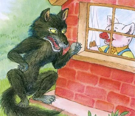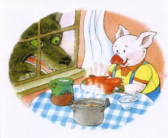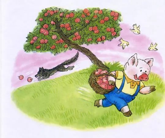 大灰狼气死了,他很想破窗而入,但是他又想到了一个坏主意,于是大灰狼说:“小猪小猪,我知道哪里的苹果长得又红又大。”