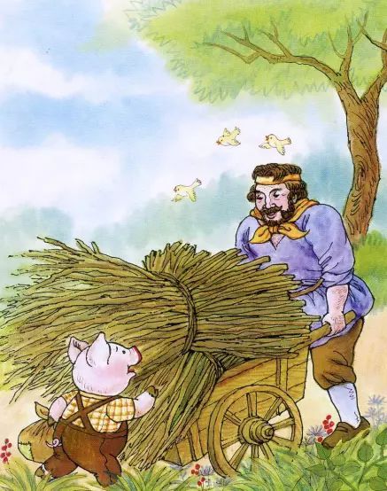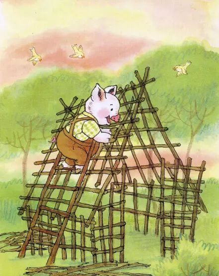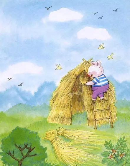 卖稻草的货郎看他很可怜,便给了他一些稻草,小猪三下五除二的就搭好了一间摇摇晃晃的稻草屋。