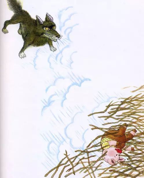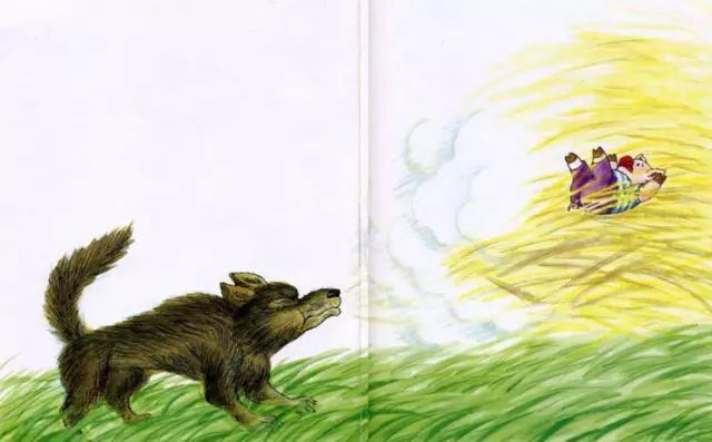 大灰狼深呼一口气,鼓起肚子,一口气儿就把窝棚屋吹翻了,然后他把凑合也吃掉了。