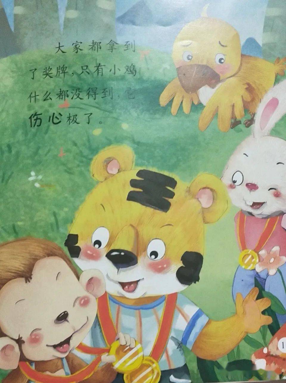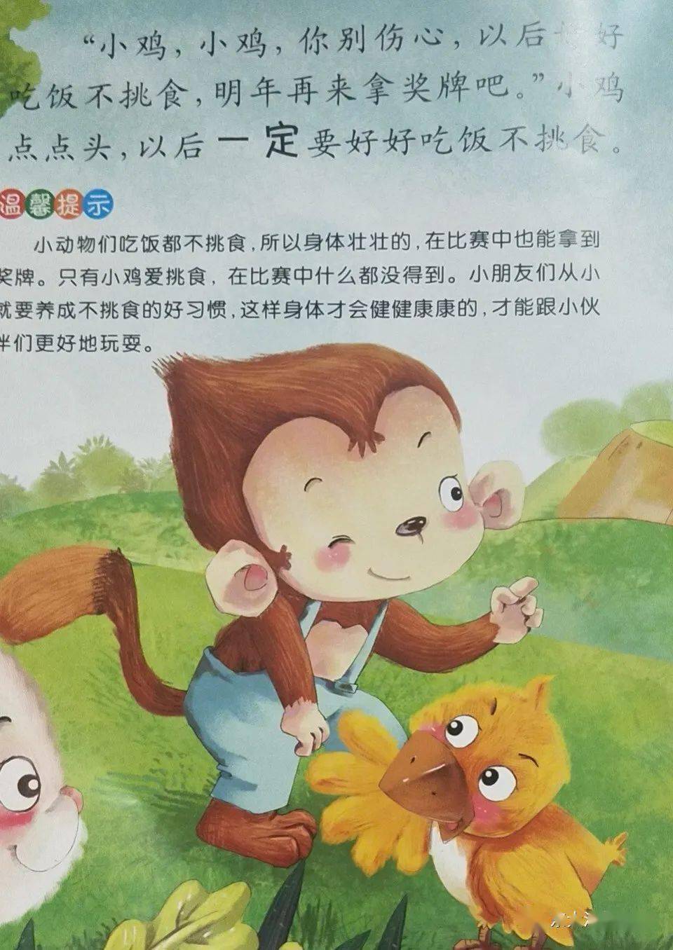 小动物们吃饭都不挑食,所以身体壮壮的,在比赛中也能拿到奖牌。只有小鸡爱挑食,在比赛中什么都没有得到。所以小朋友们从小要养成不挑食的好习惯,这样身体才会健健康康的,才能跟小伙伴们更好地玩耍。