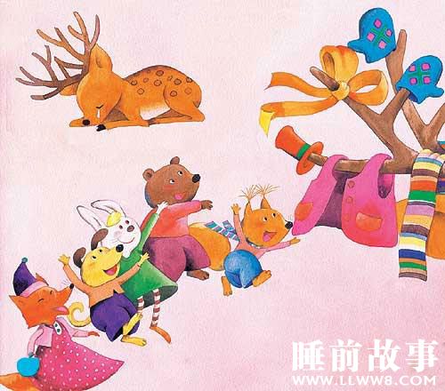大家听了他的话,笑得更厉害了。原来,小鹿的角上晾着很多东西:小猫的蝴蝶结、小松鼠的围巾、小兔的手帕,还有鼹鼠的手套、小猴的鞋子、小熊的小背心……