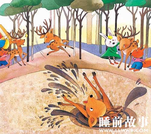 有一次,小鹿摔了一跤,大角插进了泥地里。他四脚朝天躺在那里,直到朋友们来救他,才爬起来。