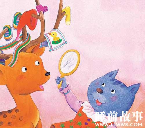 小猫拿出一面小镜子给小鹿:“你自己看看吧。”小鹿朝小镜子里一看,惊奇得叫出声来。