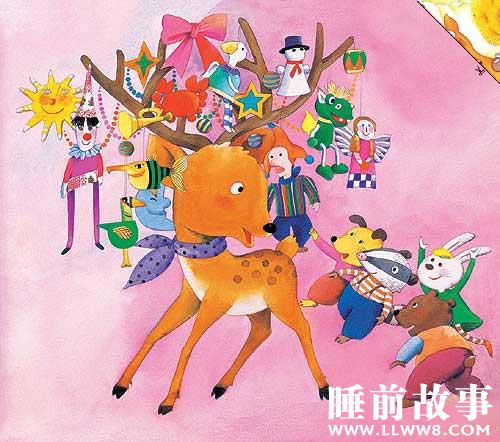 最棒的一次是在圣诞节,大家都往他的大角上系礼物。他一走,大角上的礼物就丁丁当当响,小鹿觉得自己就像一棵圣诞树,那种感觉真是好极了。
