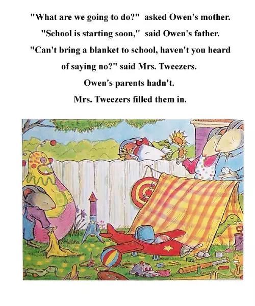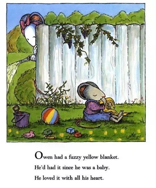一只叫做阿文的小老鼠,他有个习惯,无论是走路、吃饭、睡觉还是和其他小朋友玩时,都一定要带着他心爱的小毯子,有小毯子陪着阿文,他心里就很安稳,也不会整天都黏着妈妈和爸爸。但是,他慢慢长大,上小学了,他仍然不能离开小毯子。由于阿文太小而毯子太大,阿文的妈妈爸爸觉得要改变这样的情况,既不让阿文过分地依赖小毯子,又不能让阿文感觉失去了小毯子,怎么办呢?终于,妈妈爸爸和阿文商量好,把小毯子剪下一块给阿文做了一块手绢,这样,阿文依然可以带着他心爱的“小毯子”,但也能很好地与同学相处,适应学校的生活了。