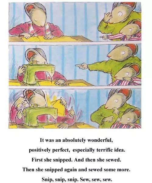 妈妈把小毯子剪成一块、一块的,再用缝纫机把它们的四个边儿车起来,妈妈把小毯子做成了许多条小手绢儿。