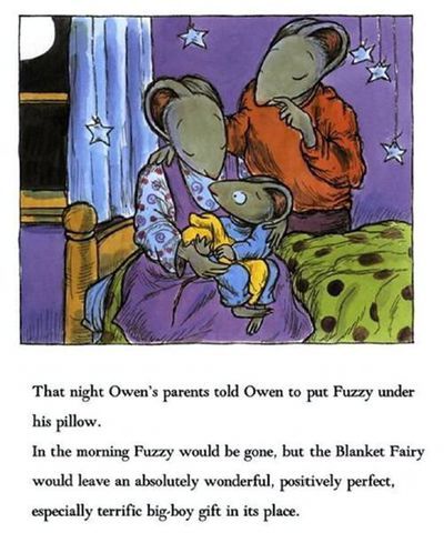 这天晚上,爸爸告诉阿文:“如果你把小毯子放在枕头下,明天早上,小毯子就不见了,但是毛毯小精灵会留给你一个非常棒的礼物。