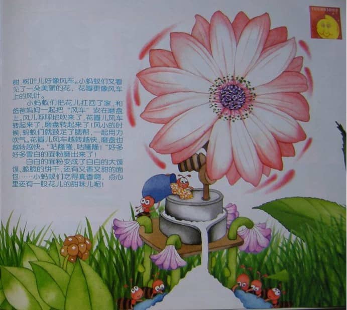 小蚂蚁们把花儿扛回家,和爸爸妈妈一起把“风车”安在磨盘上,风儿呼呼地吹来了,花瓣儿风车转起来了!风小的时候,蚂蚁们就鼓足了腮帮,一起用力吹气。花瓣儿风车越转越快,磨盘也越转越快,好多好多雪白的面粉磨出来了!