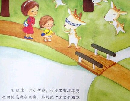 经过一片小树林,树林里有漂漂亮亮的梅花鹿在玩耍。妈妈说:“这里是梅花鹿幼儿园。”