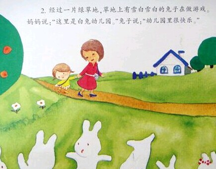 经过一片绿草地,草地上有雪白雪白的兔子在做游戏。妈妈说:“这里是白兔幼儿园。”