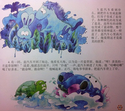 有一回,蓝汽车开到了海边,他看见大海,以为是一片蓝草原。他说:“呀!多美的一片蓝草原呀!”说着,他就直望前开。只听“扑通”一声,蓝汽车掉进了大海。咕嘟咕嘟他喝了好多水。“救命啊,救命啊!”他喊起来。正巧,海龟爷爷游来,把蓝汽车背上了岸。