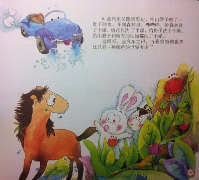 蓝汽车又跑到海边,伸出管子,吸了一肚子的水,开道森林里,哗哗哗,给森林洗了个澡,给花儿洗了个燥,给房子洗了澡,给小猴子和所有的动物都洗了澡。这回啊,蓝汽车觉得,五彩缤纷的世界比只有一种颜色的世界美多了。