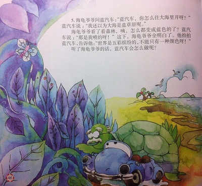 海龟爷爷看了看森林,咦!怎么都变成蓝色的了?蓝汽车说:“那是我喷的呀!”这下,海龟爷爷全明白了。他拍拍蓝汽车,告诉他:“世界是五彩缤纷的,不能只是一种颜色啊!”