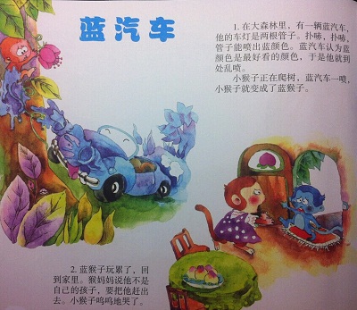 小猴子正在爬树,蓝汽车一喷,小猴子就变成了蓝猴子。蓝猴子玩累了,回到家里,猴妈妈说这不是自己的孩子,要把他赶出去。小猴子呜呜地哭了。