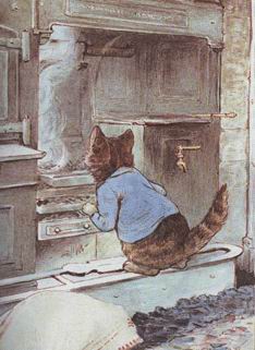 炉火刚刚点燃,烟囱里还不是很热;不过有一些呛人的白色烟雾从新鲜的绿色柴枝上冒出来。汤姆小猫爬上了炉子的围栏,向上望去。这是一个式样很古老的壁炉。