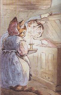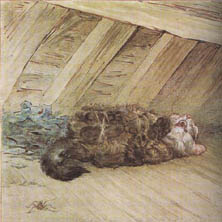 塔比瑟太太上上下下跑遍了整个房子,喵喵呼唤着汤姆小猫。她在楼下的食品室里上看下看,她在堆满脏被单的储藏室里左转右转。她跑上楼梯,钻进阁楼,可哪儿都找不到她的小猫。