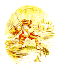 杰里米先生穿上了一件雨衣,还有一双闪闪亮的橡胶套鞋,他拿上钓竿和鱼篓,就一路大步流星地蹦跳着,来到了自己停泊小船的地点。